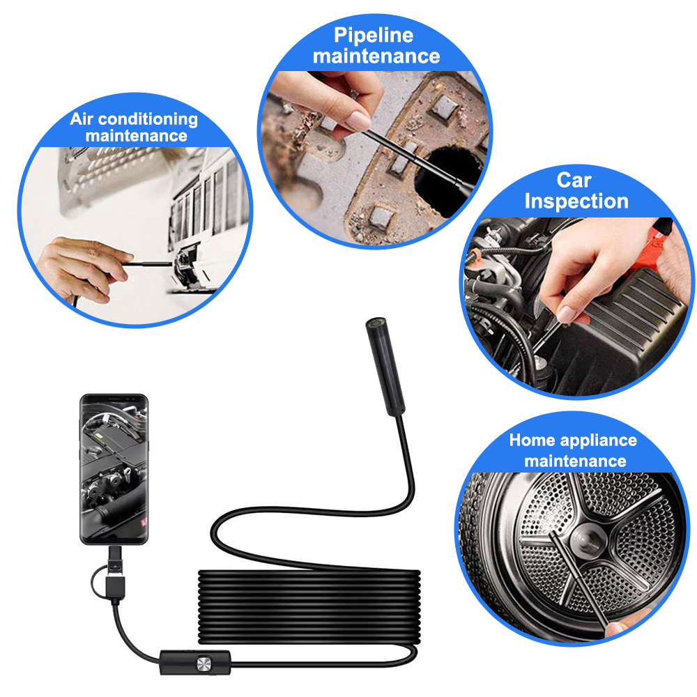 This miniature endoscope camera (5.5mm) is a high-performance three in one USB inspection camera designed specifically for industrial pipeline inspection, automotive maintenance, HVAC diagnosis, and various confined space inspections.
